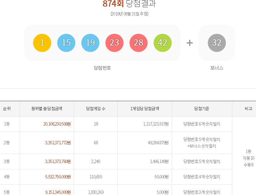 874회 로또 당첨 번호 1등 숫자는 1, 15, 19, 23, 28, 42이 나왔으며 2등 보너스번호는 32으로 1등 당첨자는 총 18명이며 자동 10명 수동 8명이 나왔답니다.