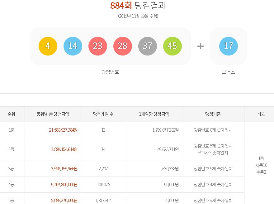 884회 로또 당첨 번호 1등의 행운의 숫자는 4, 14, 23, 27, 37, 45 이며, 2등 보너스숫자는 17이가 나왔고, 844회 로또 당첨 번호 1등 당첨자는 총 12명으로 자동 10명, 수동 2명이 당첨 되었습니다.