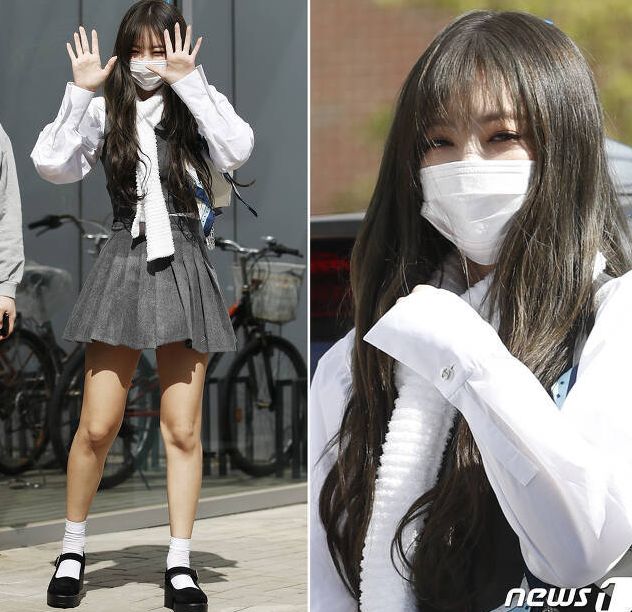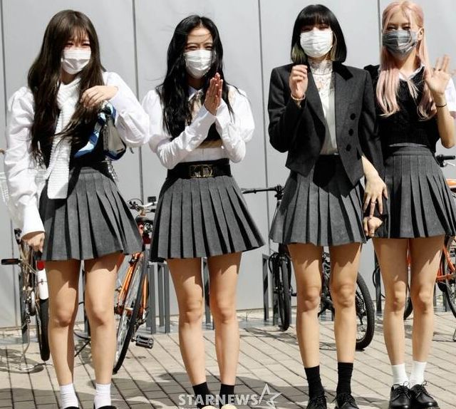 그리고 이날 블랙핑크가 예능 아는형님 촬영을 위해서 출근했다. 특히 이날 제니를 비롯한 블랙핑크는 교복의상으로 화이트 블라우스에 회색의 초미니 주름 스커트를 입고 나타났다. 여기에 화이트 머플러와 양말, 메리제인 슈즈를 신어 소녀 감성 가득한 사랑스러운 출근길 룩을 연출했다. 인형 미모를 뽐냈다.